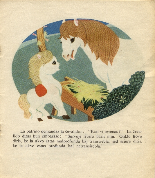 La patrino demandas la cxevalidon: "Kial vi revenas?" La cxevalido diras kun embaraso: "Survoje rivero baris min. Onklo Bovo diris, ke la akvo estas malprofunda kaj transirebla; sed sciuro diris, ke la akvo estas profunda kaj netransirebla."