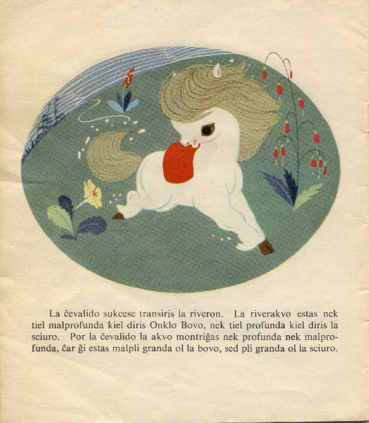 La cxevalido sukcese transiris la riveron. La riverakvo estas nek tiel malprofunda kiel diris Onklo Bovo, nek tiel profunda kiel diris la sciuro. Por la cxevalido la akvo montrigxas nek profunda nek malprofunda, cxar gxi estas malpli granda ol la bovo, sed pli granda ol la sciuro.