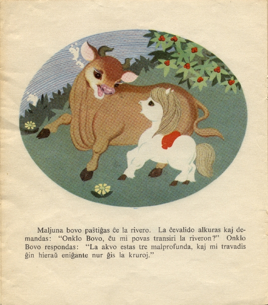 Maljuna bovo pasxtigxas cxe la rivero. La cxevalido alkuras kaj demandas: "Onklo Bovo, cxu mi povas transiri la riveron?" Onklo Bovo respondas: "La akvo estas tre malprofunda, kaj mi travadis gxin hieraux enigxante nur gxis la kruroj."